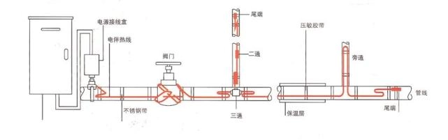 3.电伴热带安装时应紧贴在管道上,尽可能采用铝胶带粘贴,途径处的油污和水分,应处理干净,用耐热胶带将电热带沿径向固定。