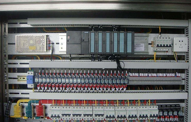 如果我们把PLC控制柜拆开的话,能够发现这么几个部分,空气开关、PLC、电源、继电器和接线端子,其中咱们刚刚看过的PLC才是真正的核心。